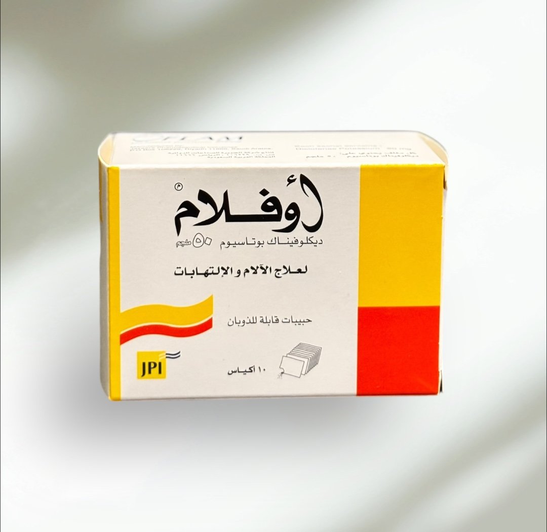 أوفلام حبوب تحتوي على مادة الديكلوفيناك ، أوفلام اكياس تستخدم كمضاد للروماتيزم ومسكن ومضاد للالتهاب وخافض للحرارة