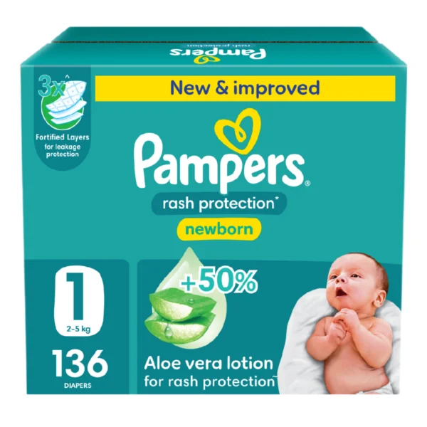 • حفاضات بامبرز للحماية من التسلخات مع الأشرطة، مقاس 1، 2 إلى 5 كلغ، صندوق جامبو، 136 قطعة