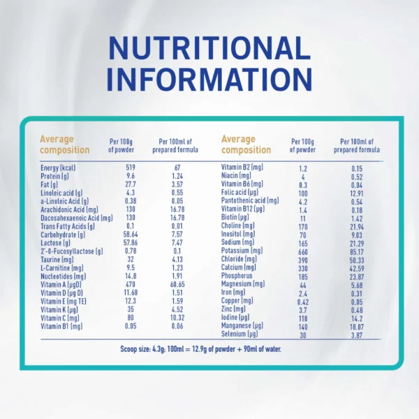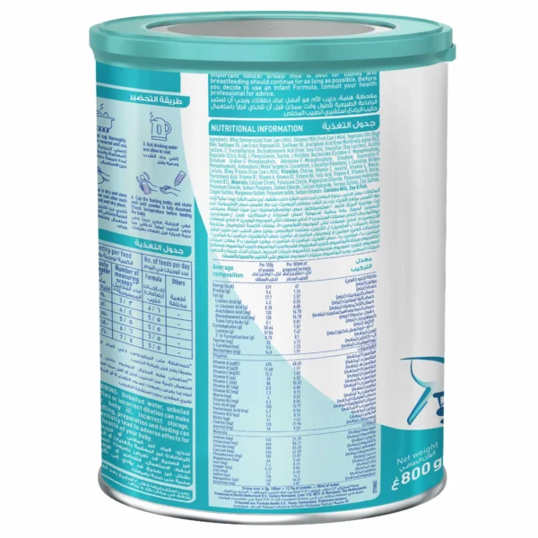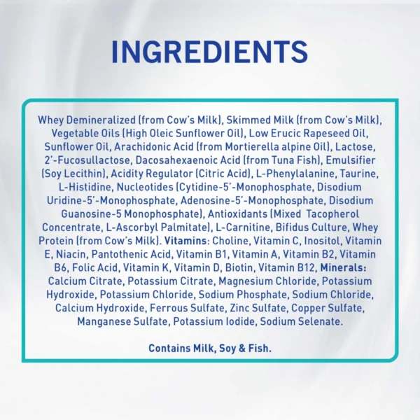 - المكونات: بروتين مصل حليب البقر، حليب بقر مقشود مجفف، أولين النخيل، لاكتوز، زيت بذر اللفت منخفض الأيروسيك، زيت جوز الهند، زيت دوار الشمس، مالتودكسترين، زيت السمك (من سمك التونا)، مستحلب (ليسيثين الصويا)، زيت نباتي (من فطر المورتيريلا ألبينا)، إل-فينيل ألانين، مستنبت البيفيدوس، تورين، إل – هيستيدين، إينوسيتول، فيتامينات، معادن.